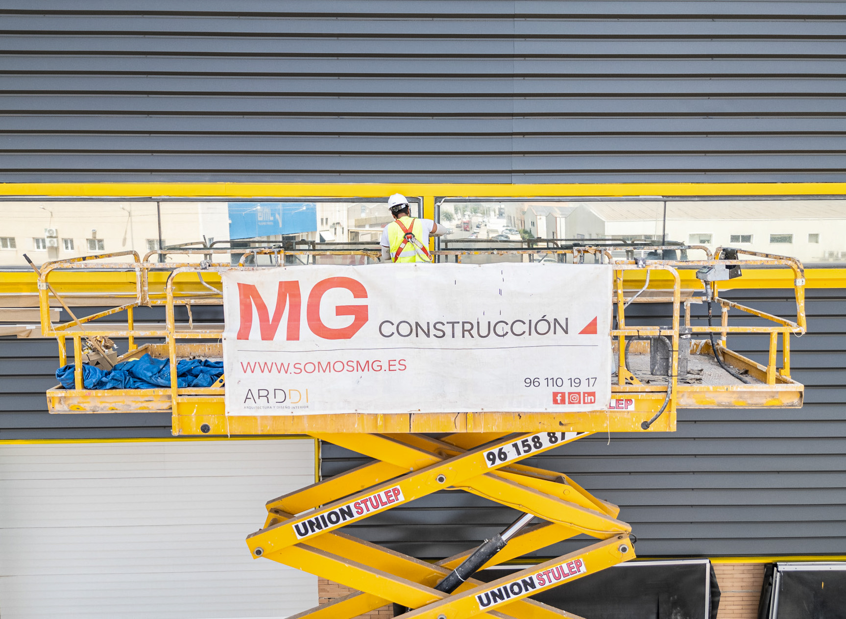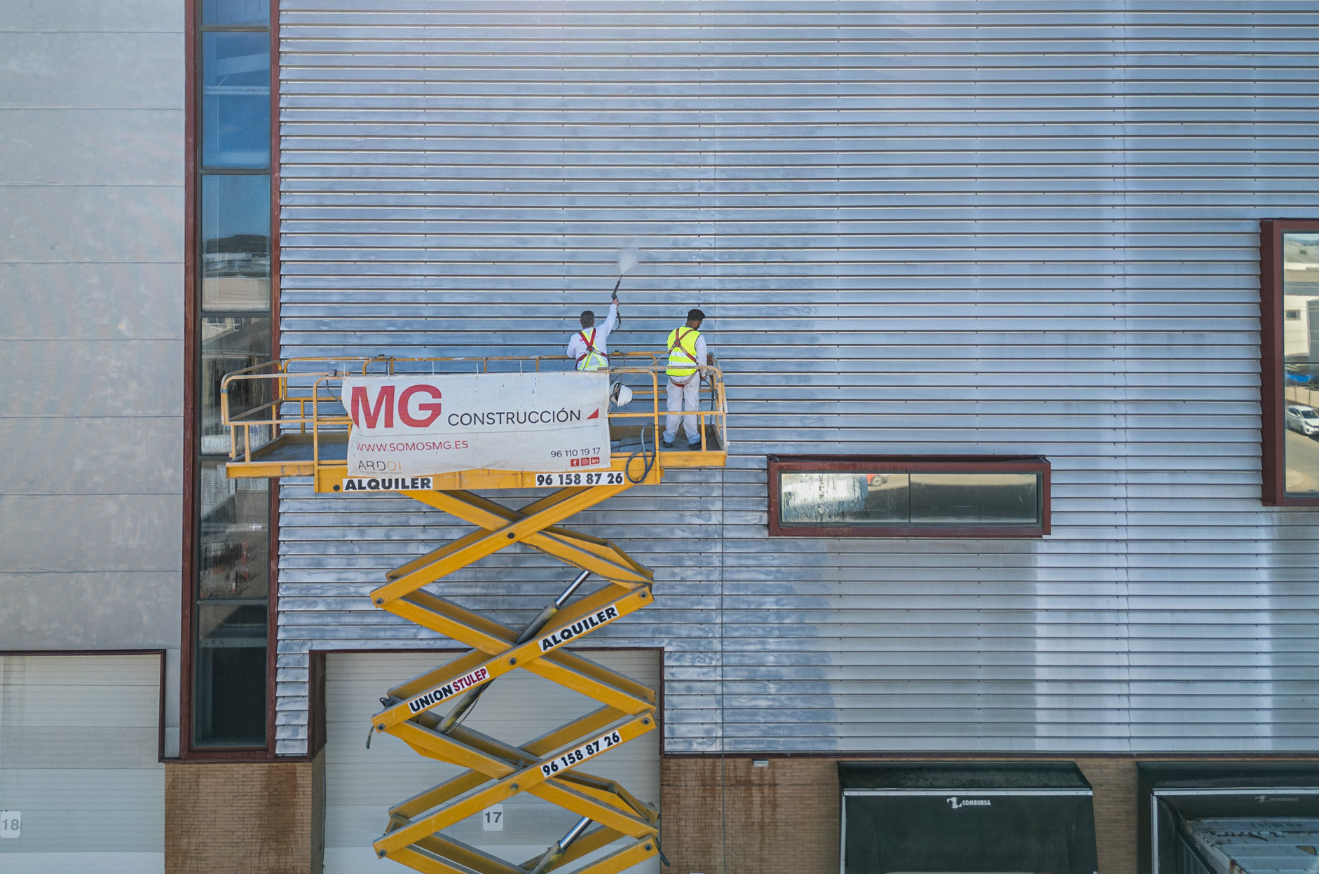 Tratamiento de fachada: apertura del poro mediante lijado mecánico, limpieza mecánica con agua a presión y aplicación de pintura base DTM Aqua 2C.